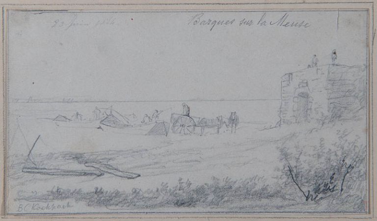 Schiffe auf der Maas, ein Fuhrwerk und ein altes Gebäude rechts. Bezeichnet: Barques sur la Meuse 23 Juni 1844