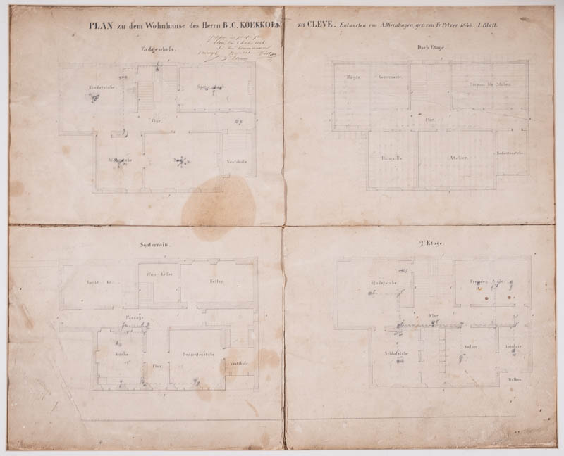 Grundriss Haus Koekkoek; vier Grundrisse der verschiedenen Etagen ("Souterrain, Erdgeschoss, 1e Etage, Dach Etage") des von Weinhagen entworfenen Hauses von B.C. Koekkoek (gebaut 1847-1848).