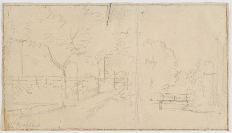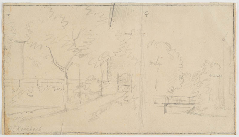 Skizzenbuchblatt: zwei Landschaftsskizzen nebeneinander, durch einen Strich getrennt; links Zugangsweg zu einem Gatter; rechts Brücke mit (beschrifteten) Bäumen.