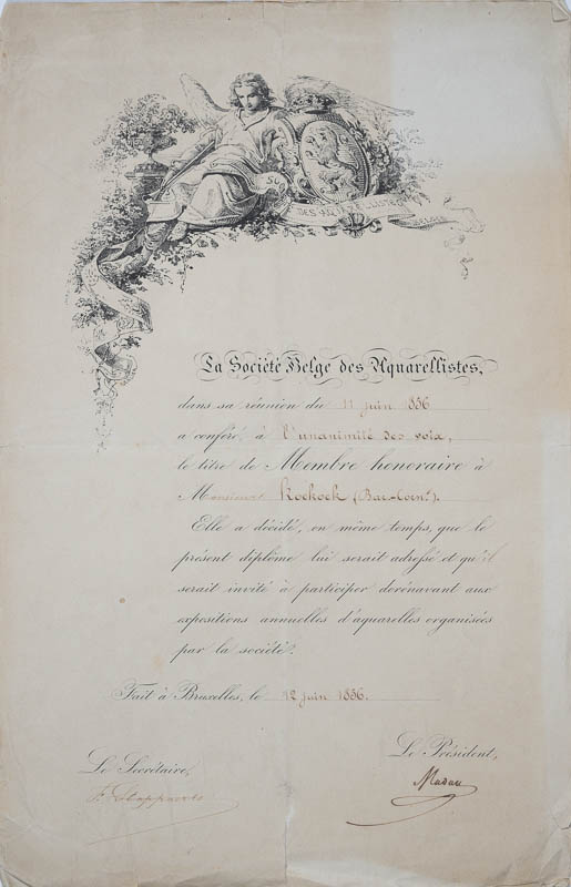 Urkunde für Ehrenmitglied der Société Royale Belge des Aquarellistes - Belgische Gesellschaft für Aquarellmalerei, 11. Juni 1856.