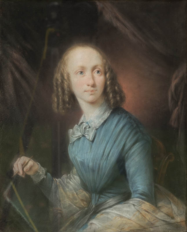 Porträt der Elise Daiwaille; Elise mit Zeichenmappe und Stift in der rechten Hand.