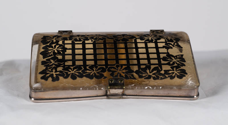 Zigarettendose aus durchsichtigem Zelluloid mit versilberter Metallfassung; im Deckel versilberte Rauten in Blumenrand eingelegt.