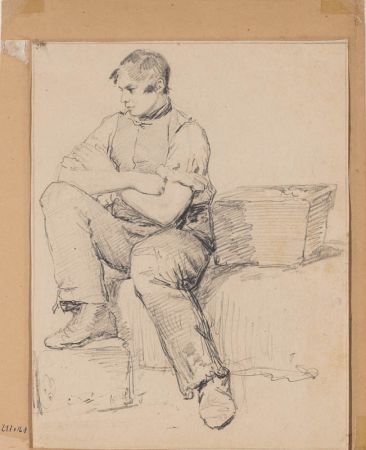 Sitzender junger Arbeiter, mit verschränkten Armen, den rechten Fuß auf einer Kiste abgestellt; neben sich eine weitere Kiste; Figurenstudie.