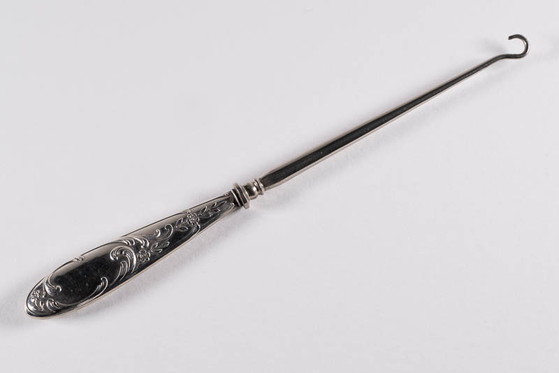 Garniturteil; langer Knopfhaken für Schuhe; floraler Reliefdekor am Griff.