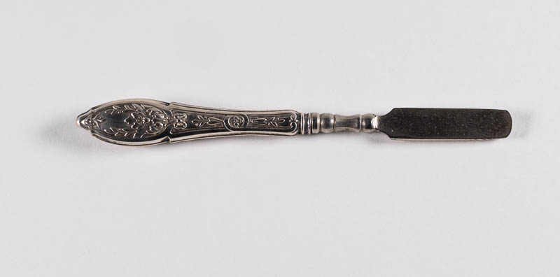 Zwei Stücke aus einer Garnitur: ornamentales Reliefdekor an den Griffen; Nagelhautschieber (A) und Pinzette (B).
