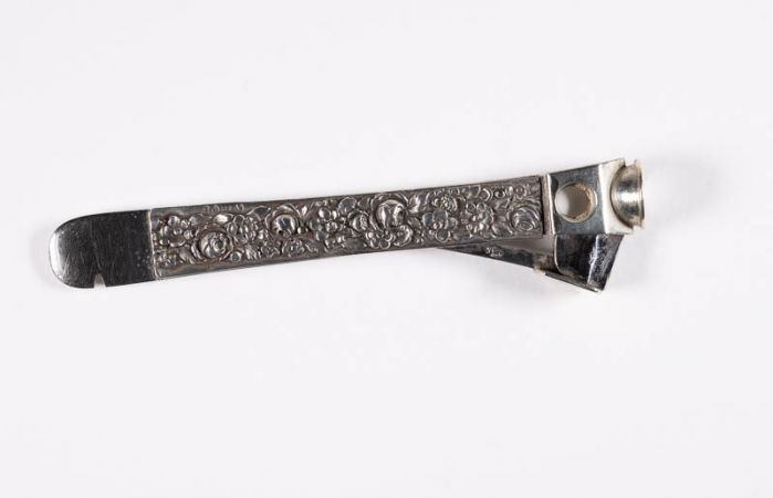 Zigarrenknipser; längliches Gerät aus Stahl, mit bewegbarem Teil zum abschneiden von Zigarrenspitzen; an beiden Seiten bekleidet mit Silberreliefs mit reichem Blumendekor.