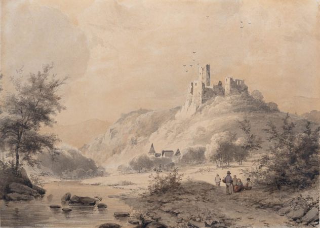 Blick auf Burgruine (Burg Ase?) am Berg eines Flusses, im Mittelpunkt ein Dorf, Altenahr. Der Blick führt in die Tiefe entlang des Flusses, auf dem Weg eine Gruppe Wanderer.