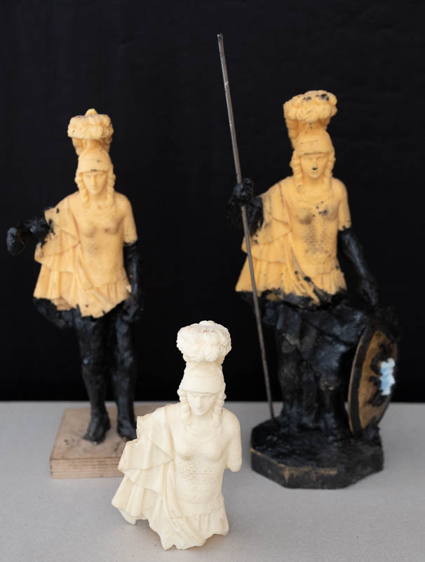 Entwurfsmodell, dreimal, für die Nachbildung der Minerva von Stracké auf dem Atelierturm Belvedere; 1-Minerva ohne Speer und Schild, 2- Minerva mit Speer und Schild, 3- Kunststoffnachbildung der Überreste des Originals von Stracké in Miniaturform, mit Abgussform.