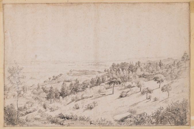 Blick von den Höhen bei Beek auf Zyfflich. Bezeichnet: Dorp Sevlik van de Beeksche bergen gezien naar de Kleefsche bergen