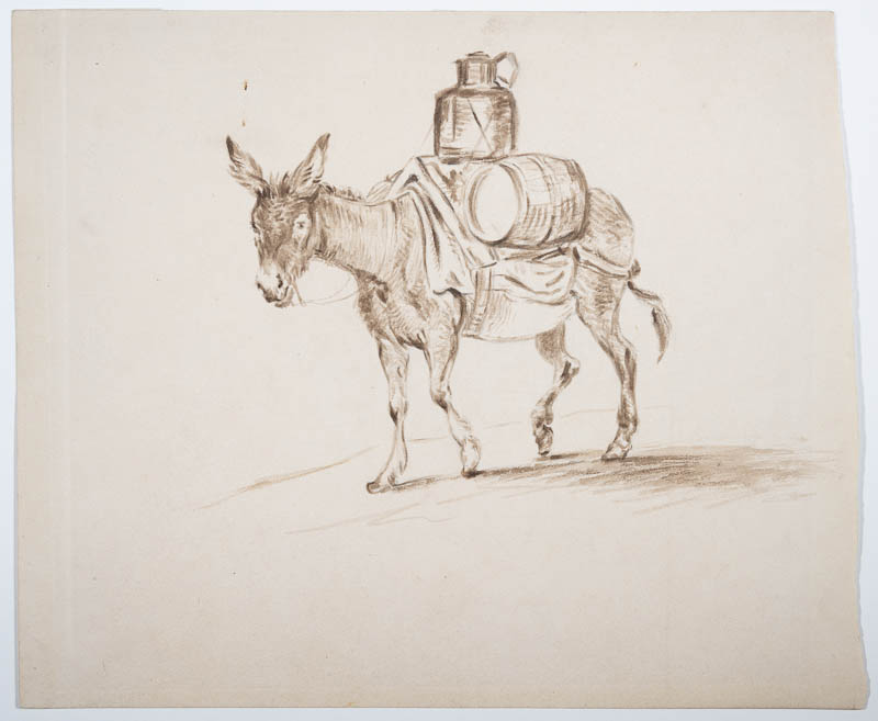 Studie eines Esels, laufend nach links, mit Faß und Kanne auf dem Rücken.
