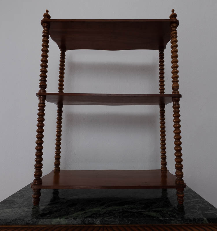 Regal mit drei Böden; gedrehte, gedrechselte Eckpfosten.