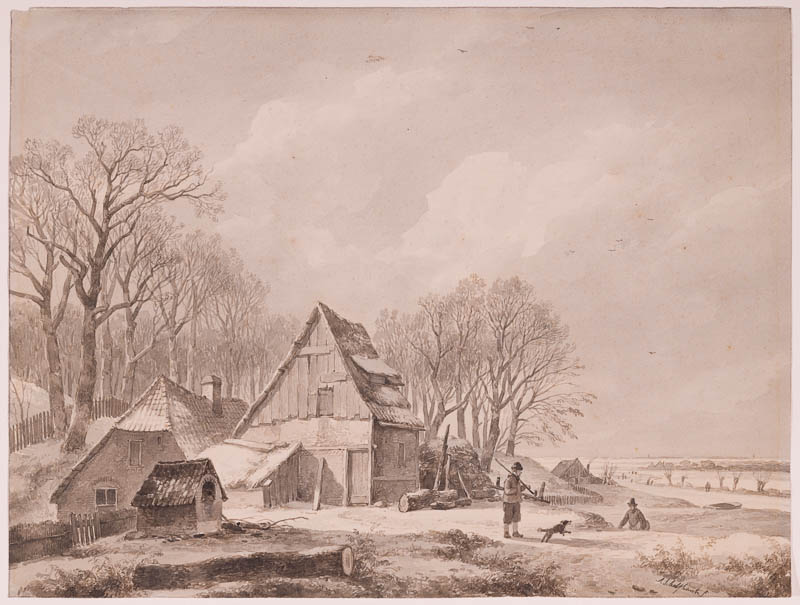 Winterlandschaft; im Vordergrund ein Gehöft vor Bäumen; ein Junge mit Stock und Hund begrüßt einen von rechts unten herbeikommenden Mann; hinter ihm Blick in eine weite, vereiste Flusslandschaft.