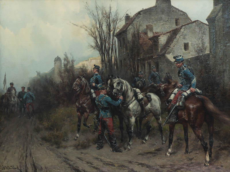 Deutsche Kavalleristen besetzen ein französisches Dorf; Szene aus dem deutsch-französischen Krieg (1870/71). IM Hintergrund ein Reiter mit weißer Flagge.