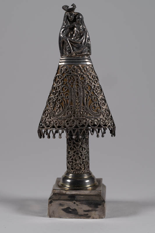 Stilisierte Mariensäule; quadratischer, mit Silber beschichteter Holzsockel, worauf eine filigrane Säule steht; Darauf ein hölzerner, filigran bekleideter Madonnenmantel; oben grob gegossene Halbfigur von Maria mit dem Kind.