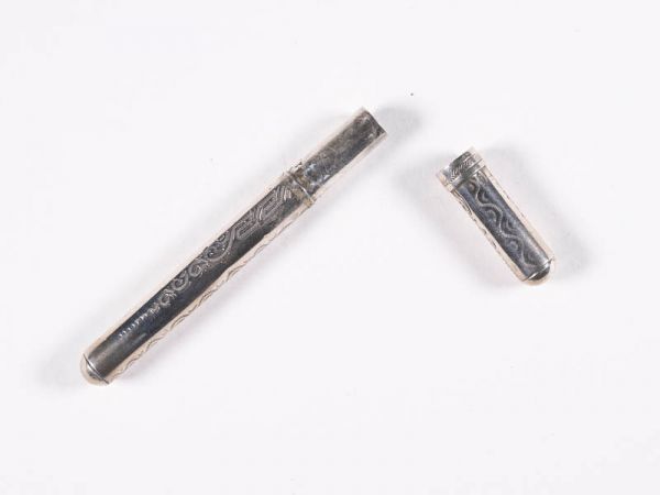 Lange runde Büchse mit Deckel; auf der Büchse viermal längliche Ornamentgravuren, abwechselnd einfach und reich.