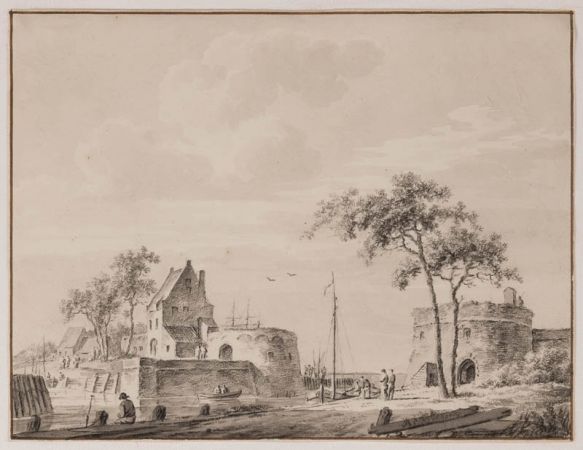 Die Stadt Veere mit Hafenmündung; im Vordergrund links sitzt ein Mann auf der Kaimauer am Flussufer; im Mittelgrund links Häuserpartie (eine Variante auf den Hafeneingang in Veere); links und rechts der Flussmündung Bollwerke.