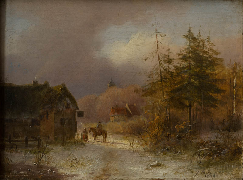 Winterlandschaft mit zugefrorenem Wasser (Kermisdal?), Schwanenturm (?) über Baumwipfeln; links Kate mit Reiter und Frau davor.