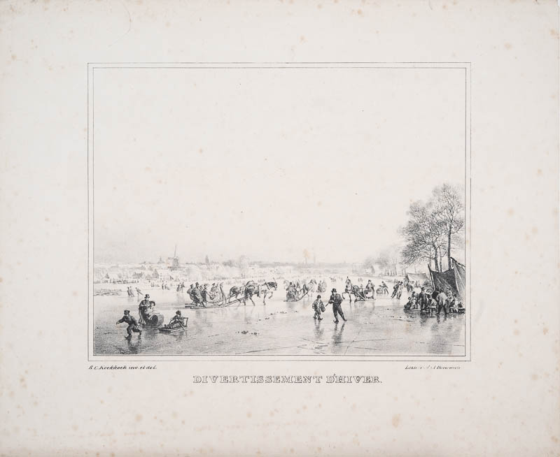 Dievertissement d'Hiver; Wintervergnügen; Pferdeschlitten und Schlittschuhläufer vor einer Stadt; aus: Album lithographique de 1830 par B.C. Koekkoek a Amsterdam chez J.A. Daiwaille.