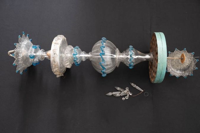 Leuchter aus hellem und blauem Glas; in Teilen im Depot aufbewahrt.