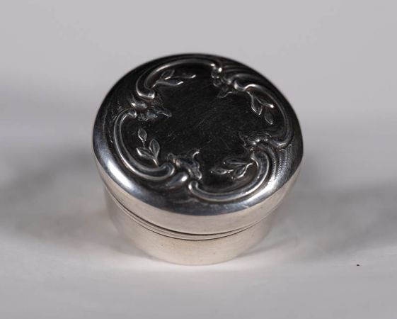 Rundes Pillendöschen mit Deckel; im Deckel Rokoko Reliefdekor; Innenseite vergoldet.