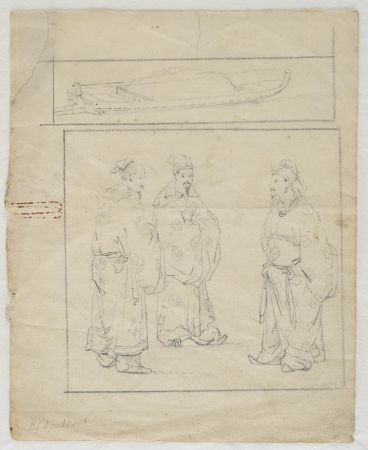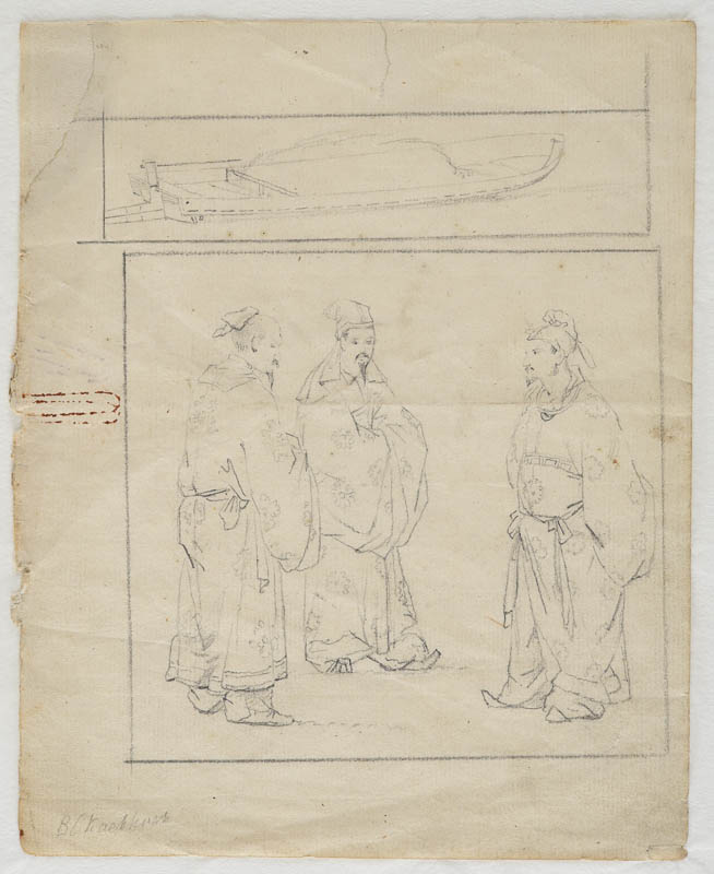Zwei umrahmte Skizzen auf einem Blatt: Figurenstudien von drei Chinesen im Gespräch; ein flaches Boot.