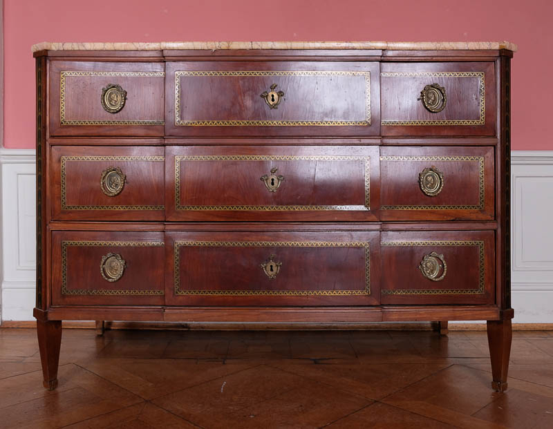 Aufwändig mit furnierten Dekorbändern und Metallbeschlägen ausgestattete Kommode, drei Schubladen, Marmorabdeckplatte; vordere Ecken abgeschrägt, vier hohe Füße.