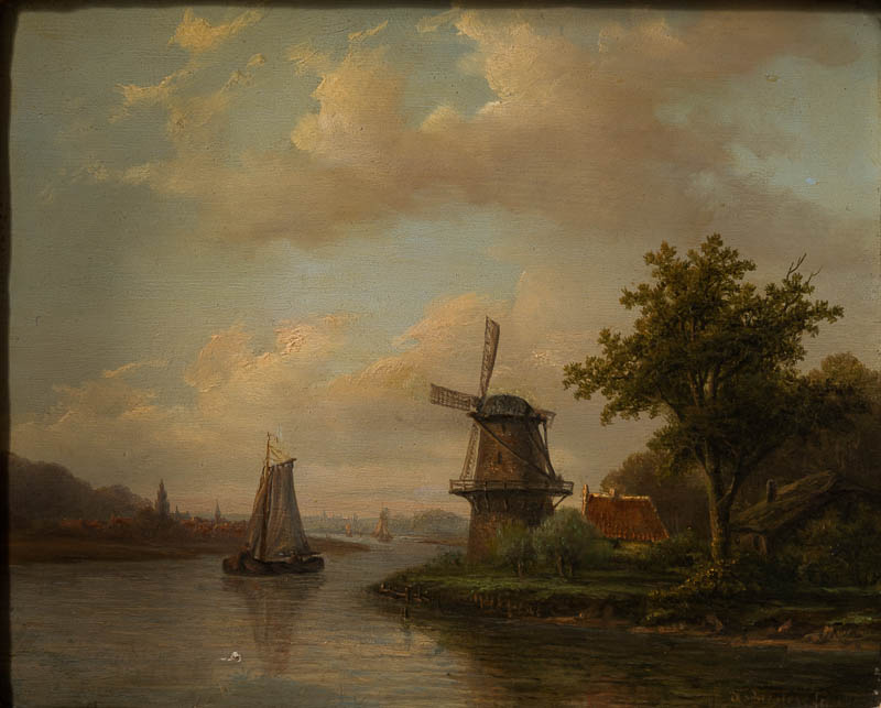 Flußlandschaft mit Mühle und Eichenholzschlag; auf einem breiten Fluß, der sich in vielen Windungen seinen Weg durch das flache Tal bahnt, fährt ein Segelboot; rechts eine Mühle mit einzelnen Häusern, die zum Teil hinter Bäumen und Sträuchern verschwinden; links in der Ferne eine Stadt mit mehreren hohen Kirchtürmen.