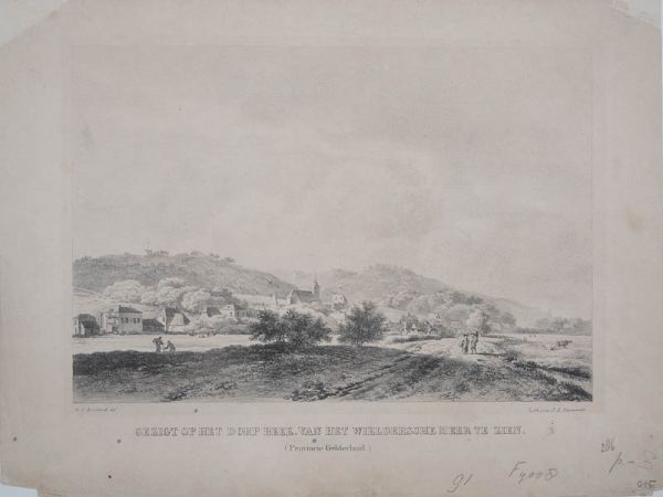 Ansicht von Beek vom Wylermeer aus: aus: Vues pittoresques du Royaume des Pays-Bas um 1830/1831 par Daiwaille et Veldhuyzen Amsterdam. Betitelt: Gezigt op het Dorp Beek, van het Wieldersche Meer te zien
