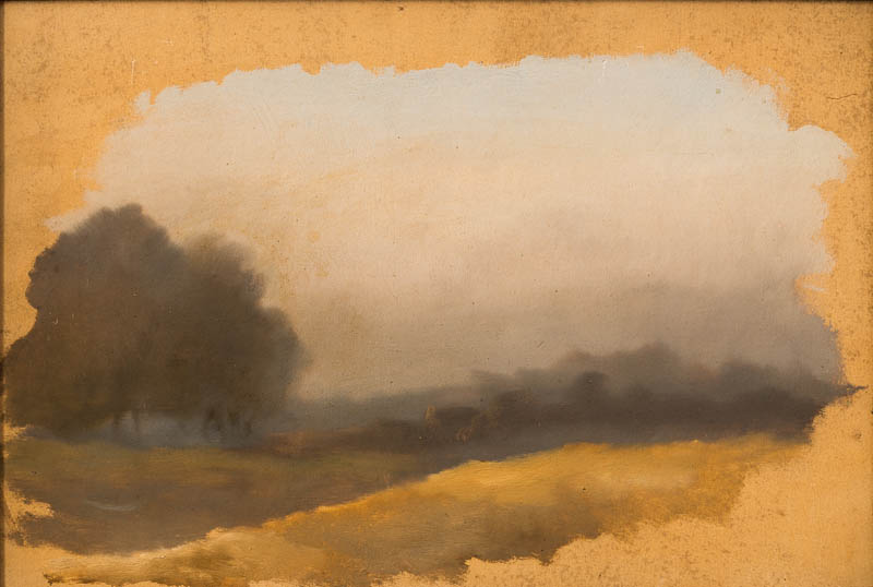 Verschwommene Landschaftsstudie mit Bäumen links.