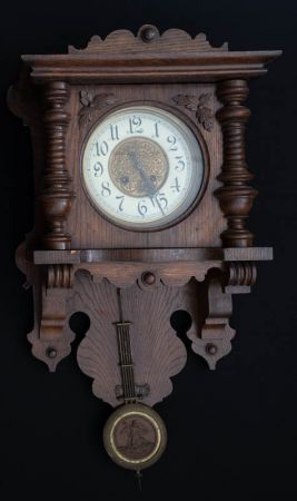 Wanduhr in Konsolenform; Dekor mit gedrechselten Säulen und Blattwerk neben dem hinter rundem Glasauge eingelassenen Uhrwerk. Zifferblatt mit arabischen Zahlen, schwarz auf weiß emaillierten Blatt, mittig floraler Dekor in Messing. Pendel in Messing rund; mittig eine Plakette aus Blech mit Darstellung von Lohengrin mit dem Schwan.