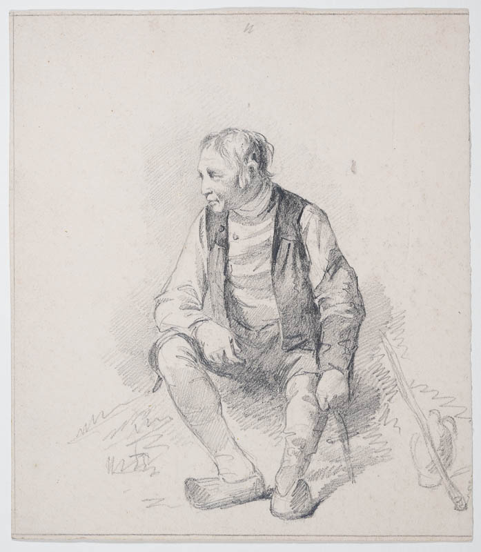 Sitzender alter Mann mit Weste, neben sich stehend ein Krug und ein Stock.
