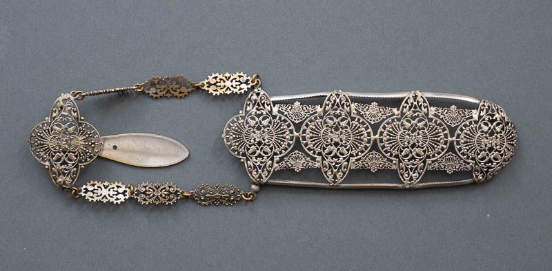 Gürtelhaken mit Hülle für lederne oder aus Stoff angefertigte Behälter, alles aus Filigran; beim Haken ist ein vierpassförmiges Ornament, beidseitig mit vier Kettengliedern verbunden, am langen Behälter, der aus drei Vierpässen und einem Endglied besteht, für folkloristische Trachten?.