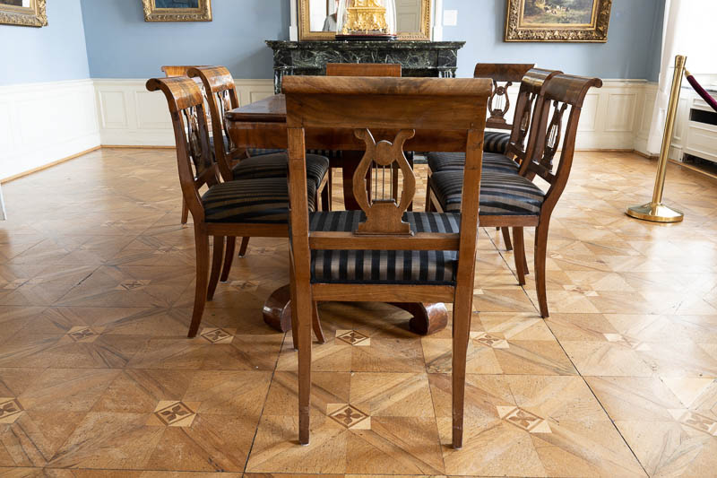 6 Stühle und 2 zugehörige Armlehnsessel; die Rückenlehne ist mit einer Lyra verziert.