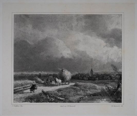 Sommerlandschaft mit Heuwagen vor einer Stadt; zum Album von A.A. Weimar gehörend (Inv. Nr. 1170), bestehend aus 18 Farblithografien und 12 schwarz-weiß Lithographien, ihrer Majestät der Königin gewidmet.