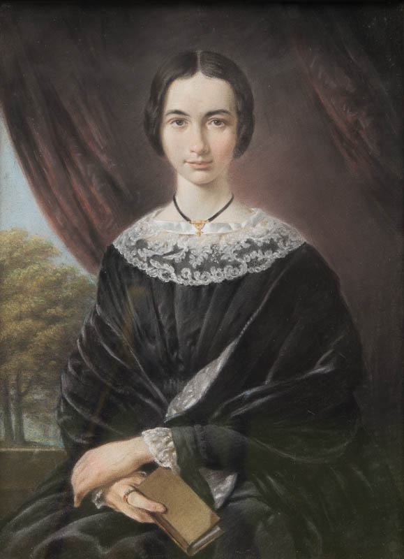 Porträt einer unbekannten jungen Frau, in der Hand ein Buch haltend, vor einer Parklandschaft (vgl. Porträt von B.C. Koekkoek derselben Person 0369/F55)