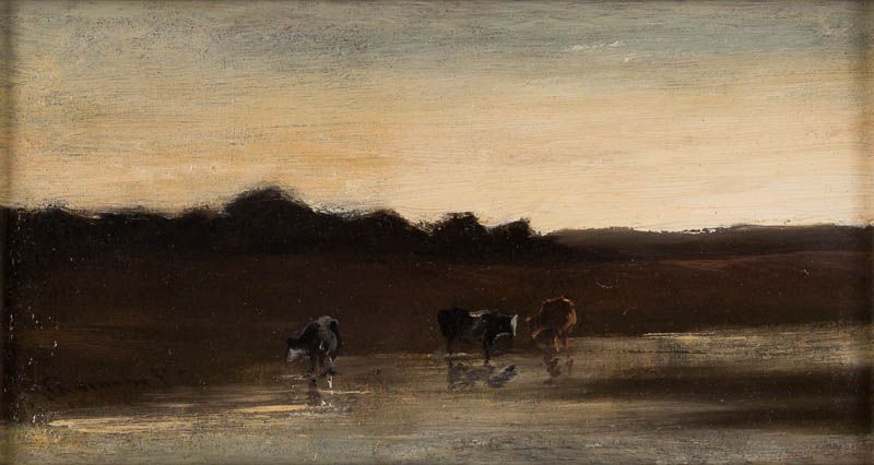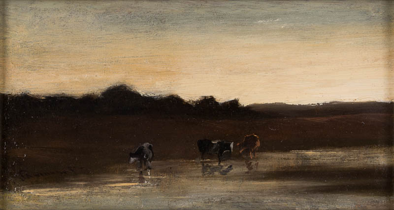 Drei Kühe in niederrheinischer Landschaft, im Wasser stehend, Zwielicht.