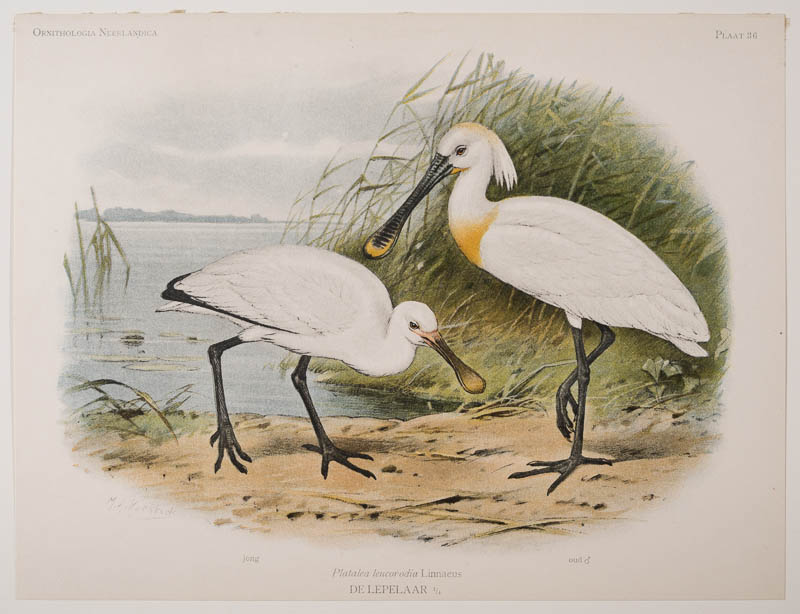 Der Löffler, Platalea leucorodia (Linnaeus); Abbildung aus "Ornithologia Neerlandica"; Plaat 36. Herausgeber Daniël van Oort (1876-1933)