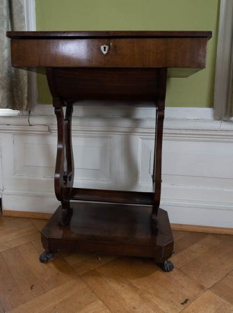 Nähtischlein, rechteckig, auf zwei lyraförmigen Beinen; rechteckige Bodenplatte mit abgeschrägten Ecken auf vier kleine Löwenfüßen.