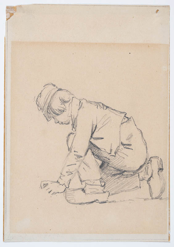 Im Profil gesehener Bauernjunge mit Schirmmütze und Holzschuhen, knieend nach links.