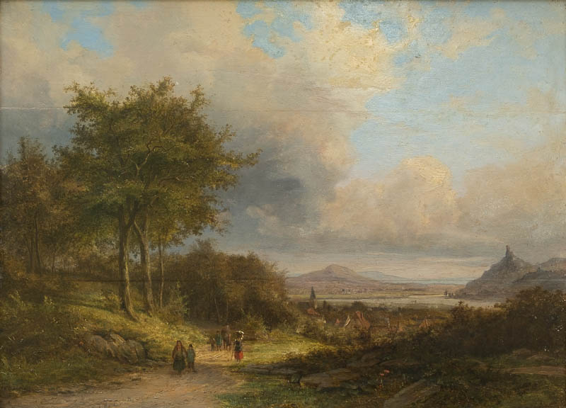 Von einer glühenden Hügellandschaft aus schaut man über ein tief gelegenes Dorf hinweg zu einem Fluss, der sich durchs Gebirge schlängelt; ganz rechts ein hoher Berg mit der Drachenfelsruine; in der Komposition ist der Einfluss von J.B. Klombeck erkennbar.