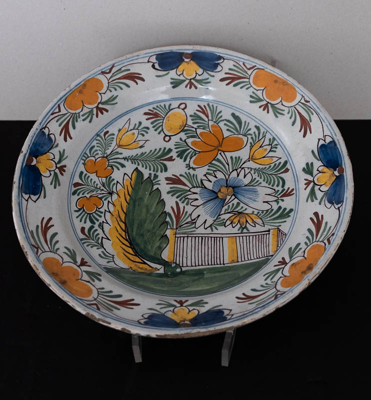 2 Wandteller, vielfarbig bemalt mit Gartenzaun und Fantasieblüten.