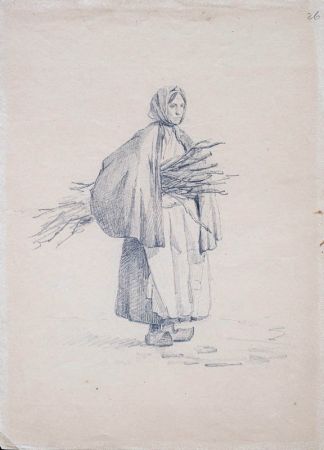 Figurenstudie einer Reisigsammlerin, ein Reisigbündel unter dem rechten Arm tragend; gekleidet in Umhang und Klompen; stehend, in leicht gedrehter Seitenansicht.
