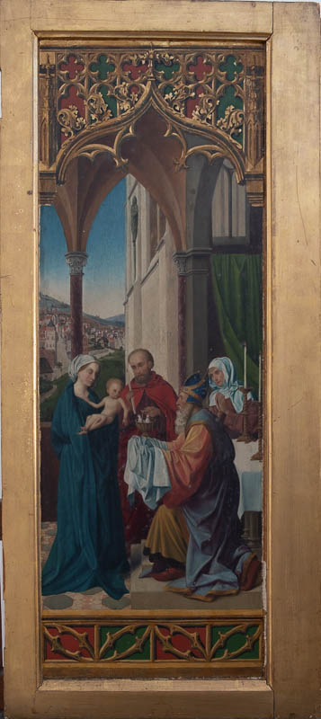 Rechter Flügel des Hausaltars des Künstlers, beidseitig bemalt, Szenen eingefasst in gotischem Gesprenge, Gold gefasster Rahmen;