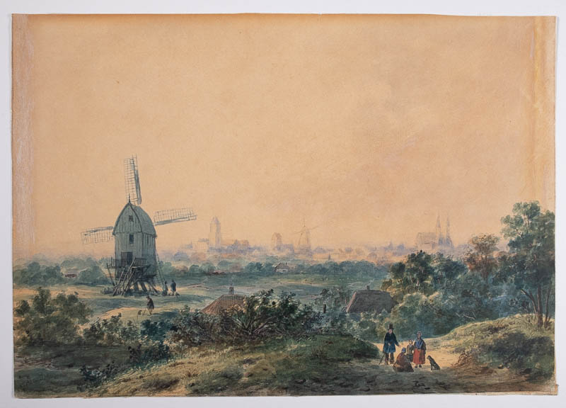 Blick auf Kleve mit der Heideberger Mühle links nach 1864; von links nach rechts in der Stadtsilhouette: Schwanenburg, Kuhhirtenturm, Teurlingsche Mühle und Stiftskirche.
