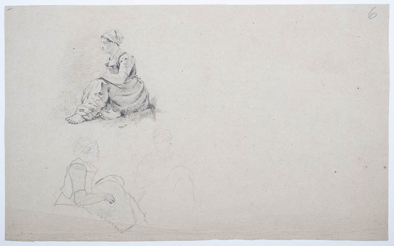 Blatt mit vollendeter Studie und zwei Skizzen einer sitzenden jungen Frau, oben vollendet; Frau sitzend nach links von der Seite gesehen, darunter skizziert: Sitzende nach rechts und von vorne.
