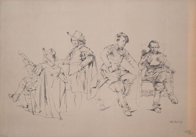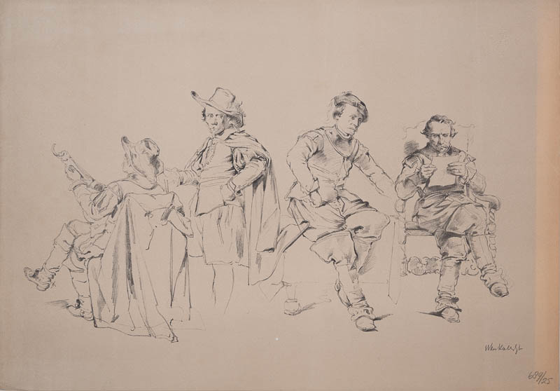 Figurenstudie von fünf Männern in verschiedenen Positionen, im Kostüm des 17. Jahrhunderts.