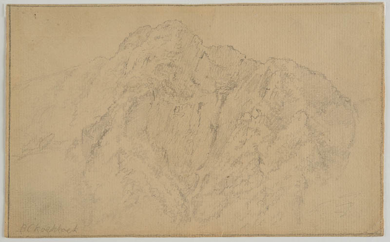 Skizzenbuchblatt: Blick auf eine bewaldete Felswand.