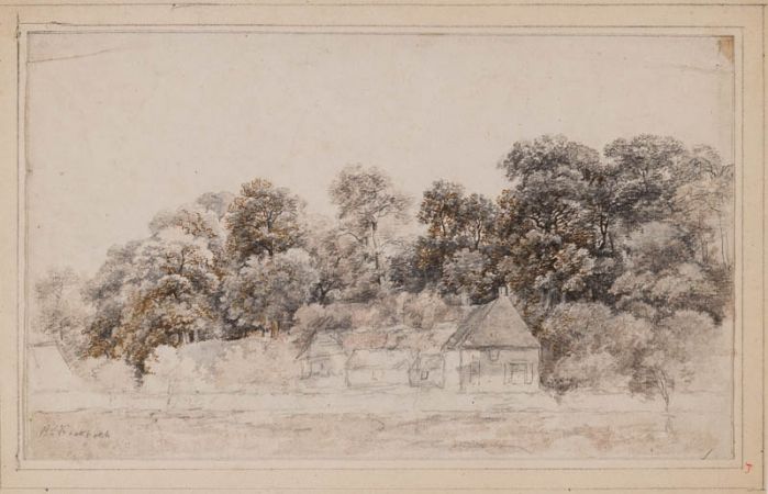 Gehöft am Waldrand; Bäume detailliert und Gehöft nur skizzenhaft dargestellt.
