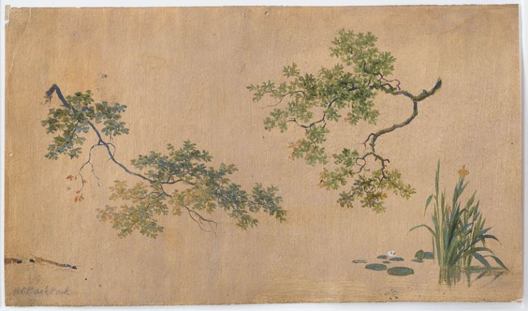 Detaillierte Studie von Wasserlilien, Seerosen und zwei Eichenzweigen auf heller Grundierung.