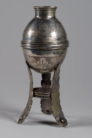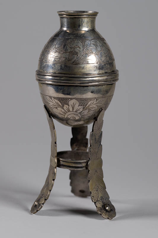Eierförmige Vase mit Schmalem Hals, auf drei Beine verbunden durch einem profiliertem Ring; zwischen obere und untere, mit grob gravierte ornamentale Bänder dekorierte Hälften ein profilierter Band; drei blattförmig ausgesägte Beine mit florale Gravierung.